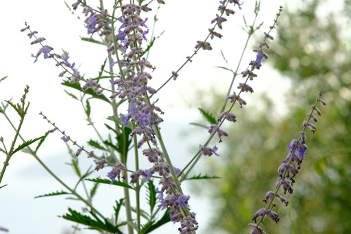 Sage flowers against the backdrop of the Ligurian sea. Sage is a spice used in Mediterranean cuisine. The plant is also cultivated in Mediterranean gardens as an ornamental plant. Stock photos. Italy. Sage flower